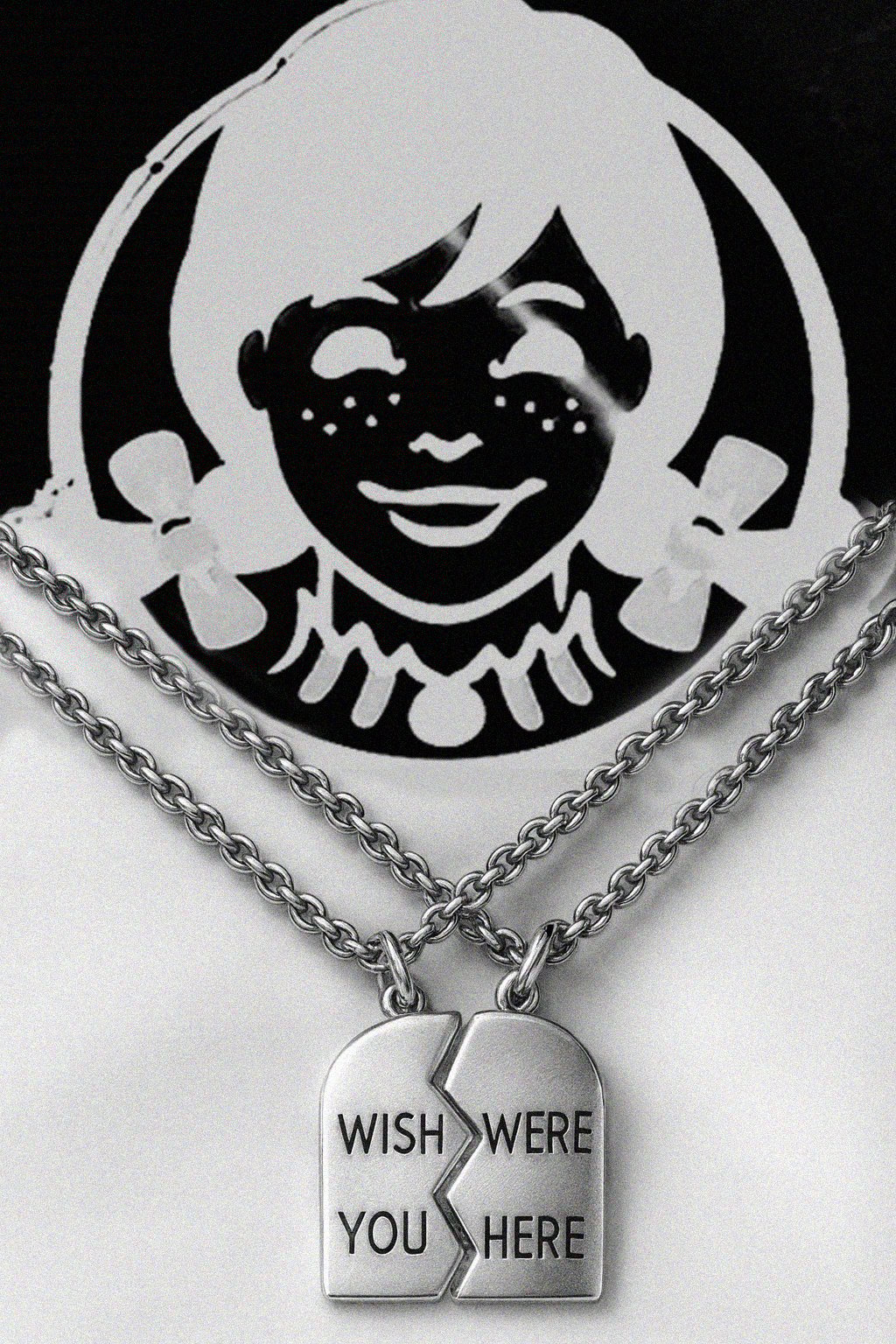 Necklace charm with chain in a bisected headstone shape, to be worn together or shared like turtle doves. The two charms form the phrase "Wish You Were Here". Charms are 1 inch tall by 1 inch wide together, and 0.125 inches thick. Cloisonné enamel in the engraved lettering.